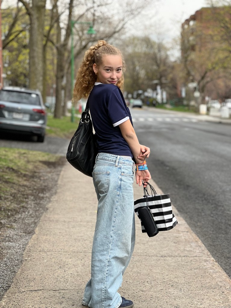 Pour les accessoires, j’ai opté pour mon sac à main à rayures noires et blanches. Il est non seulement super joli, mais aussi hyper pratique pour tout emporter avec moi. Et puis, avouons-le, il attire vraiment le regard et donne ce petit plus graphique à mon ensemble.
